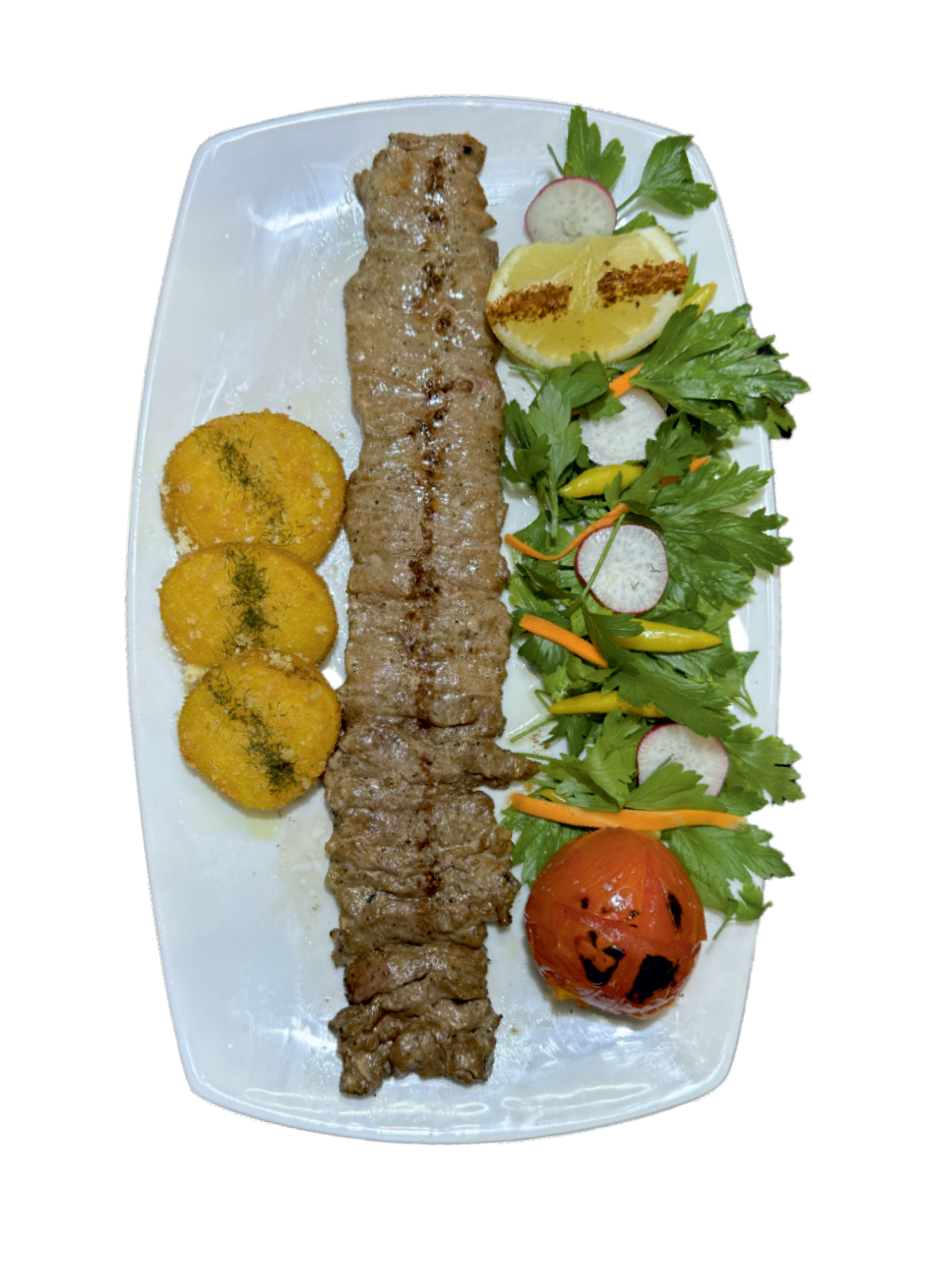 (کتلت گوسفند) فیله بره با استخوان (450 گرم) با گوجه کبابی. ترشی شده با نمک، زعفران، پیاز، فلفل سیاه، آویشن، گشنیز، روغن زیتون.