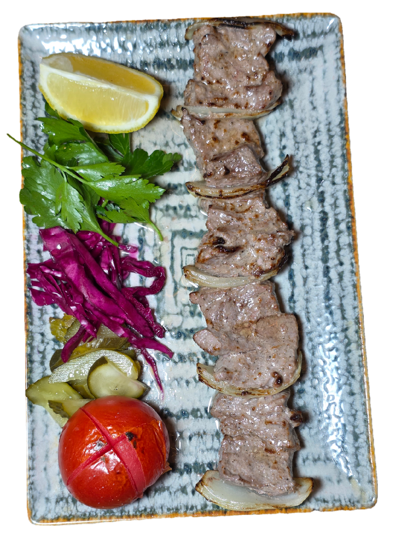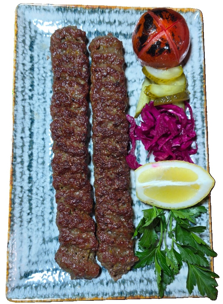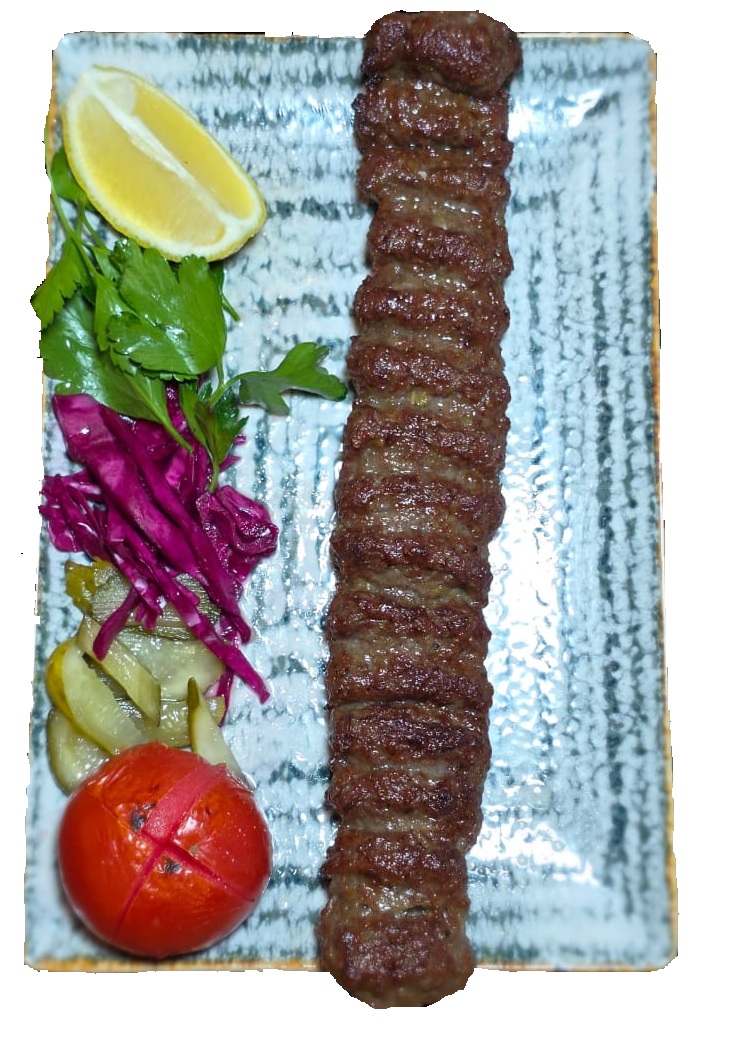یک سیخ گوشت (380 گرم) مخلوط چرخ کرده (گوشت گوسفند و گاو) با گوجه فرنگی کبابی. نمک، فلفل سیاه، پیاز.