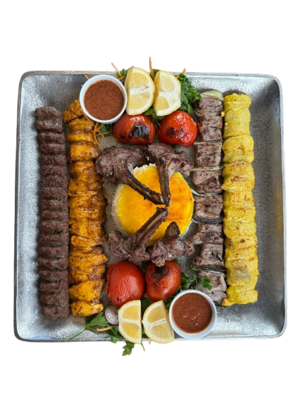 لقمه کباب ، جوجه کباب (بدون استخوان)، چنجه کباب، کتلت گوشت گوسفند، بال مرغ، سیب زمینی سرخ کرده، گوجه فرنگی کبابی، سبزیجات کبابی