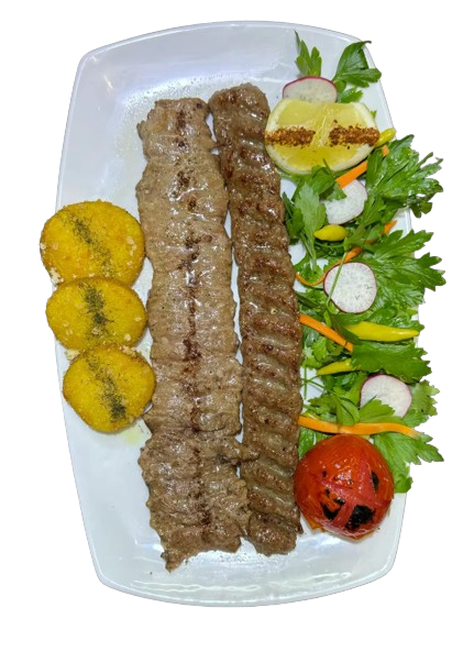 دو عدد سیخ گوشت (300 گرم) مخلوط چرخ کرده (گوشت گوسفند و گاو) با گوجه فرنگی کبابی. نمک، فلفل سیاه، پیاز.